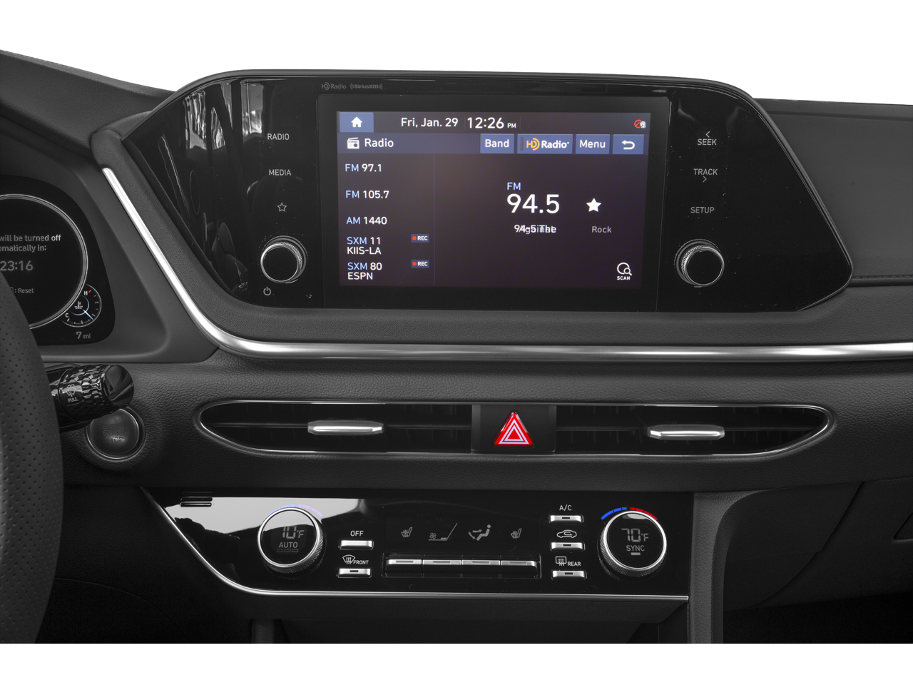 - Radio: AM/FM/MP3/HD/SiriusXM Display Audio -inc: 8" color touchscreen, 6 speakers (2 front door mounted speakers, 2 tweeters and 2 rear speakers), integrated Bluetooth®, Blue Link connected car system, Apple CarPlay, Android Auto and USB charge port